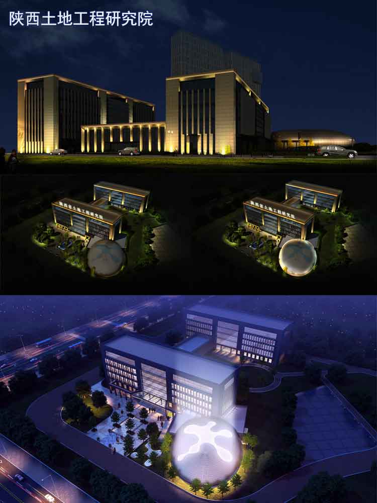 簡介—— 陜西土地工程研究院是承擔(dān)各類建設(shè)工程勘察、設(shè)計、土建、安裝、市政、石化、公路、地鐵、機(jī)場、礦山、核電、裝飾、鋼結(jié)構(gòu)、古建園林工程施工。對于設(shè)計院辦公樓體亮化設(shè)計,公司設(shè)計師跟根其前后樓體的建筑和廣場的球狀建筑的特點,采用簡單的洗墻燈和投光燈來進(jìn)行效果設(shè)計,彰顯建筑的大氣與威嚴(yán)。
