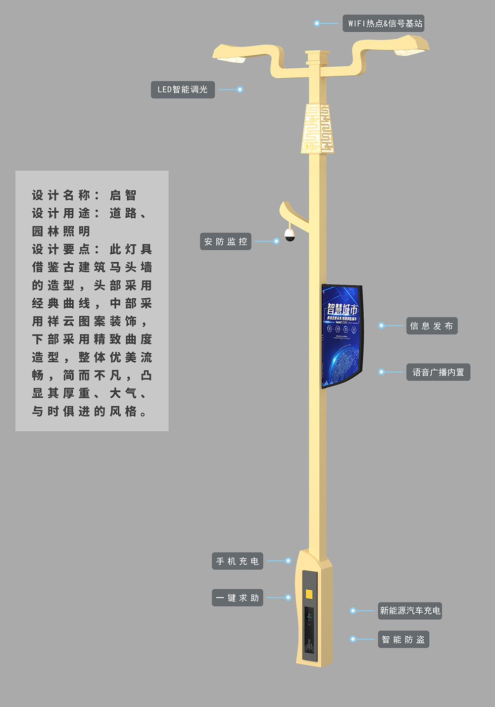 設計要點:此燈具借鑒古建筑馬頭墻的造型,頭部采用經典曲線,中部采用祥云圖案裝飾,下部采用精致曲度造型,整體優美流暢,簡而不凡,凸顯其厚重、大氣、與時俱進的風格。
